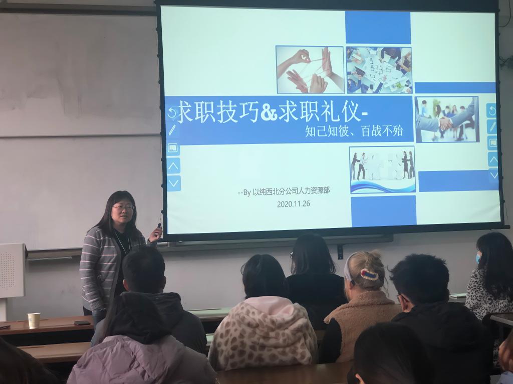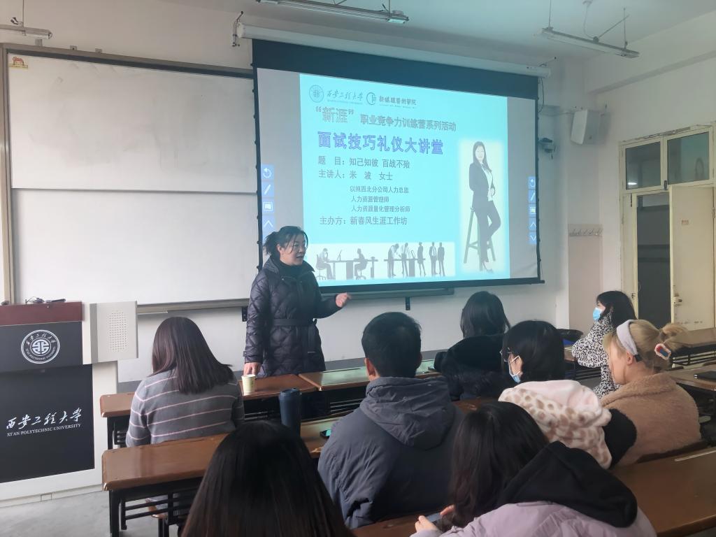 11月26日,由搜书吧 新春风生涯工作坊组织的“新涯”职业竞争力训练营系列活动之面试技巧礼仪大讲堂,在8号教学楼508教室举行。本次活动邀请了以纯西北分公司人力总监、人力资源管理师、人力资源量化管理分析师米波女士作为主讲人,我校学生就业创业指导服务中心主任刘佳、院就业辅导员张瑾及2021届部分毕业生参加了此次活动,院学生工作办公室主任赵文熙担任活动主持。