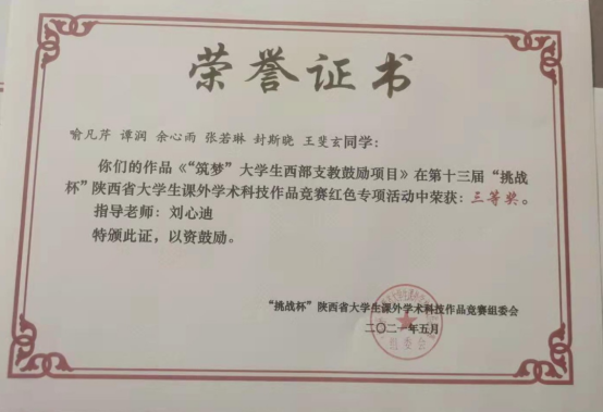 在我校入围的14件作品中,搜书吧 作品《“筑梦”大学生西部支教鼓励项目》荣获红色专项赛道三等奖。该项目由2019级编导2班喻凡芹同学负责,刘心迪老师指导,团队成员包括2019级2班的封斯晓、张若琳、余心雨、谭润、王斐玄5位同学。团队从公益性质出发,着眼于当代大学生群体中所形成的“支教热潮”,从而产生了有无偿补贴、严格筛选教师资源、网络平台认证、入出帐记录公开透明等多项创新功能的基金会。