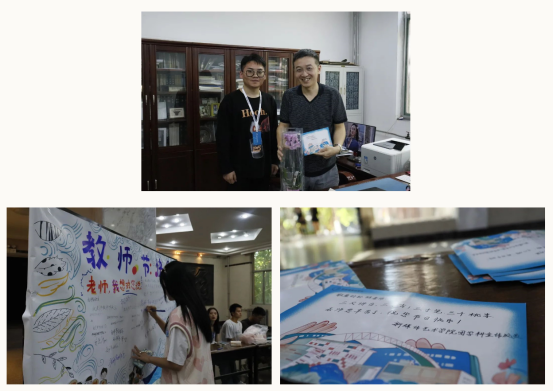 学院学生会的工作人员早早就来到学院楼,路过的同学们纷纷在展板上写下了对老师美好的祝福,并由学院学生会代表四大组织,分别向老师送去贺卡,及美好的祝福。