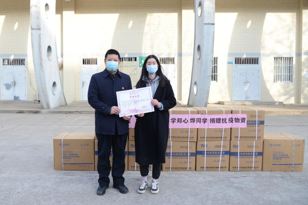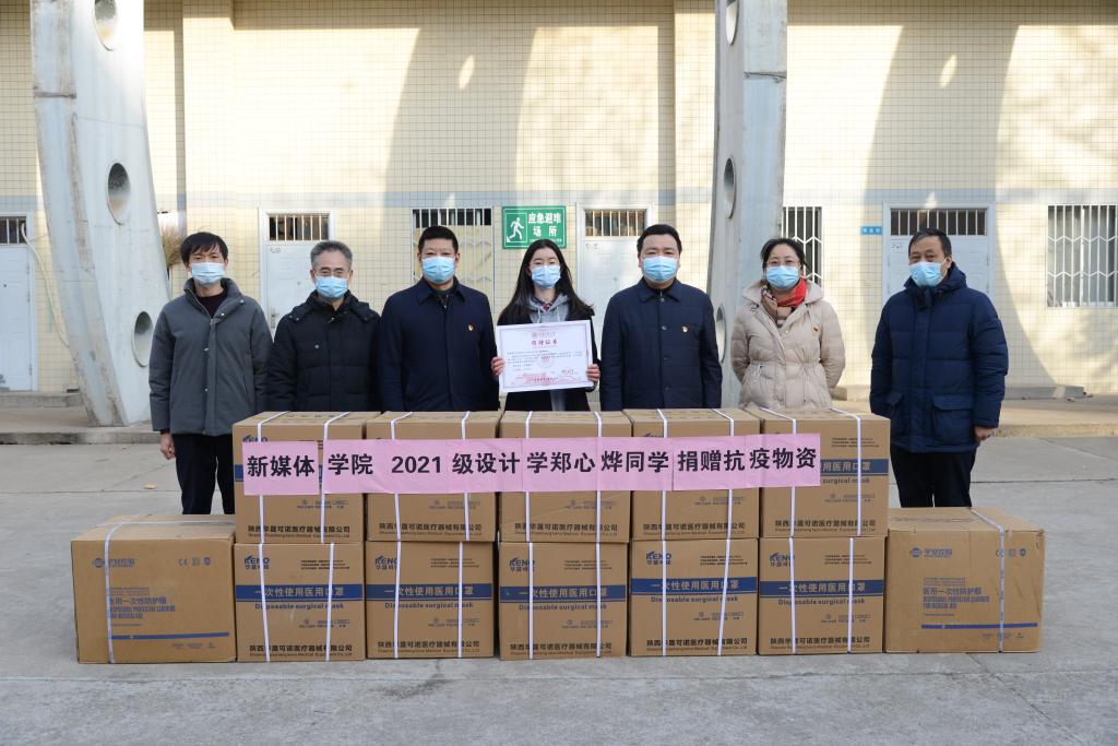 1月13日,搜书吧 2021级设计学郑心烨同学为学校捐赠了20000只一次性医用口罩和120套防护服。校党委副书记赵小峰、副校长朱永民,学生工作部(处)、国内合作与校友工作处、国资处和搜书吧 等部门负责人和教师代表学校接收了捐赠物资。