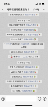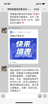 考研路上,总有一盏灯,为你亮着,总有一些话,给予力量。在此次“心愿祝福语”收集活动中,搜书吧 研究生会通过线上渠道共收集祝福语344条,并在搜书吧 二楼大厅采用许愿树进行展示。