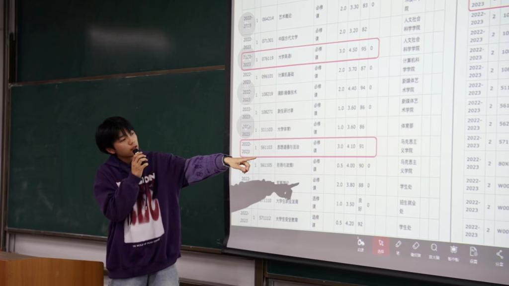 大会共分为两个板块。在学习层面,伍天翔同学展示了自己入校一年来在学习与课外活动、比赛中取得的优异成绩以及丰富的工作实践经历。他在2022—2023学年综合素质测评中,学习成绩位列年级第一,综测年级第三,且获得“优秀学生”称号。在Fa国际前沿创新艺术设计大赛(中国赛区)、2023全国大学生广告艺术大赛(陕西赛区)等竟赛中均取得优异的成绩。丰富的实践经历深刻地告诉同学们全面发展及在成长道路重视学习机会的重要性。随后,伍天翔同学着重向同学们介绍了大一新生能够参加的科研竞赛以及综合素质测评的实施细则。分科目叙述的形式以及详细分析总结自己的学习建议,不仅解答了同学们心中的诸多困惑,亦为他们今后学习进步的道路指明了方向。