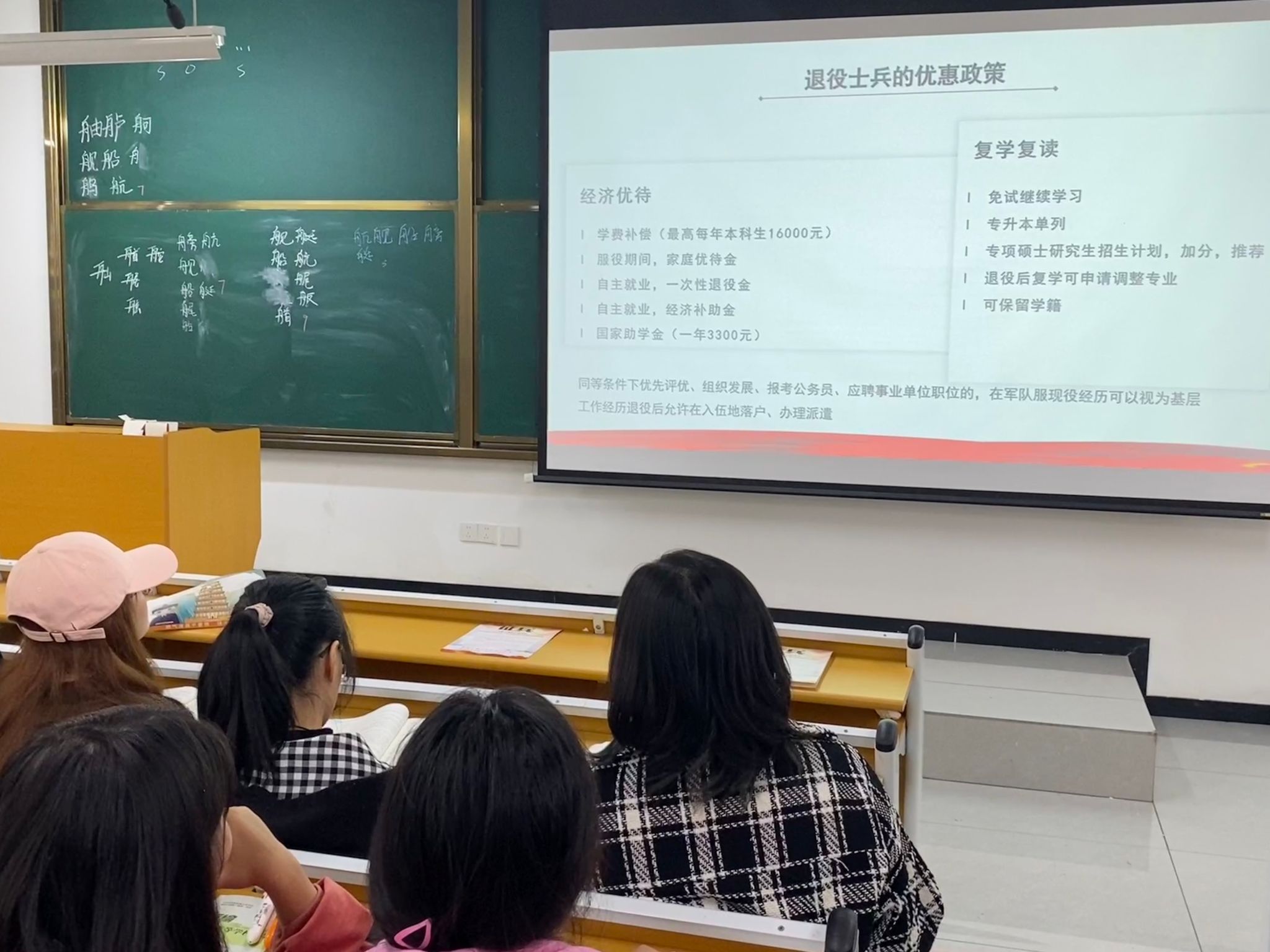 为热烈庆祝中华人民共和国成立75周年,弘扬爱国主义教育,提升学生民族自豪感,激发学生爱国热情,响应国家资助育人的号召,进一步落实退役士兵优惠政策。2024年10月9日,搜书吧 在金花校区教学楼1-301教室成功举办了“心有榜样,行有力量”——退役士兵爱国主义经验分享暨资助政策宣讲会。会议由宾田田老师主持,2024级本科生参加。