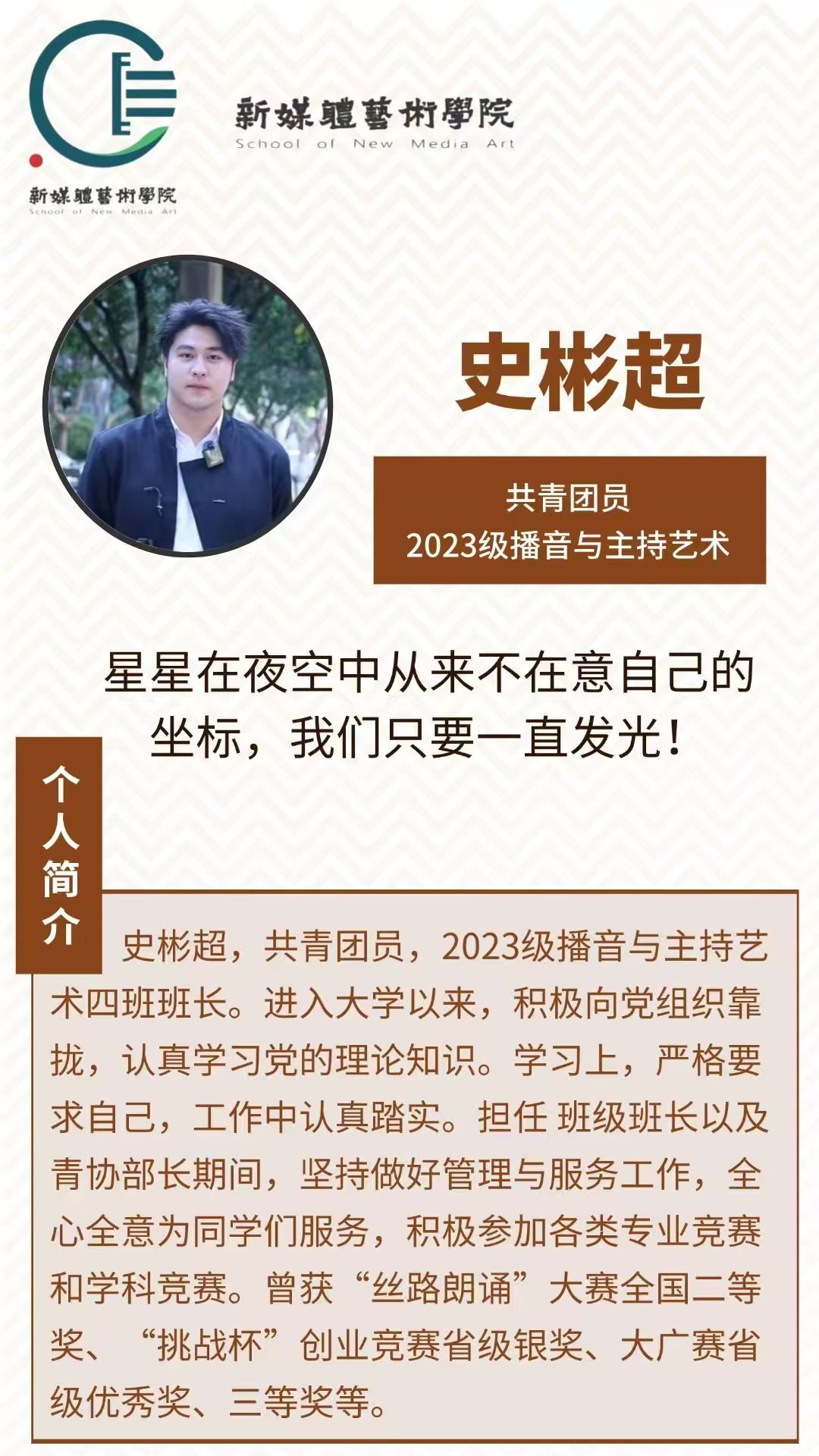 在专业学习方面,史彬超鼓励同学们学习播音与主持艺术专业一定要在比赛中让自己进步。他提到,在专业类竞赛和学科类竞赛中要崭露头角,多参与实践活动,在各种主持活动、参与拍摄和文物解说以及传媒实习中完善自我,找到自己想要追求的方向,并不断为之努力。这对个人成长和能力提升以及人脉资源的积累有着重要的意义。他建议学习播音的学生尽量让自己暴露在镜头之下,让自己展示于人前,一步一步从胆怯变得自信,最后收获一个全新的自我。