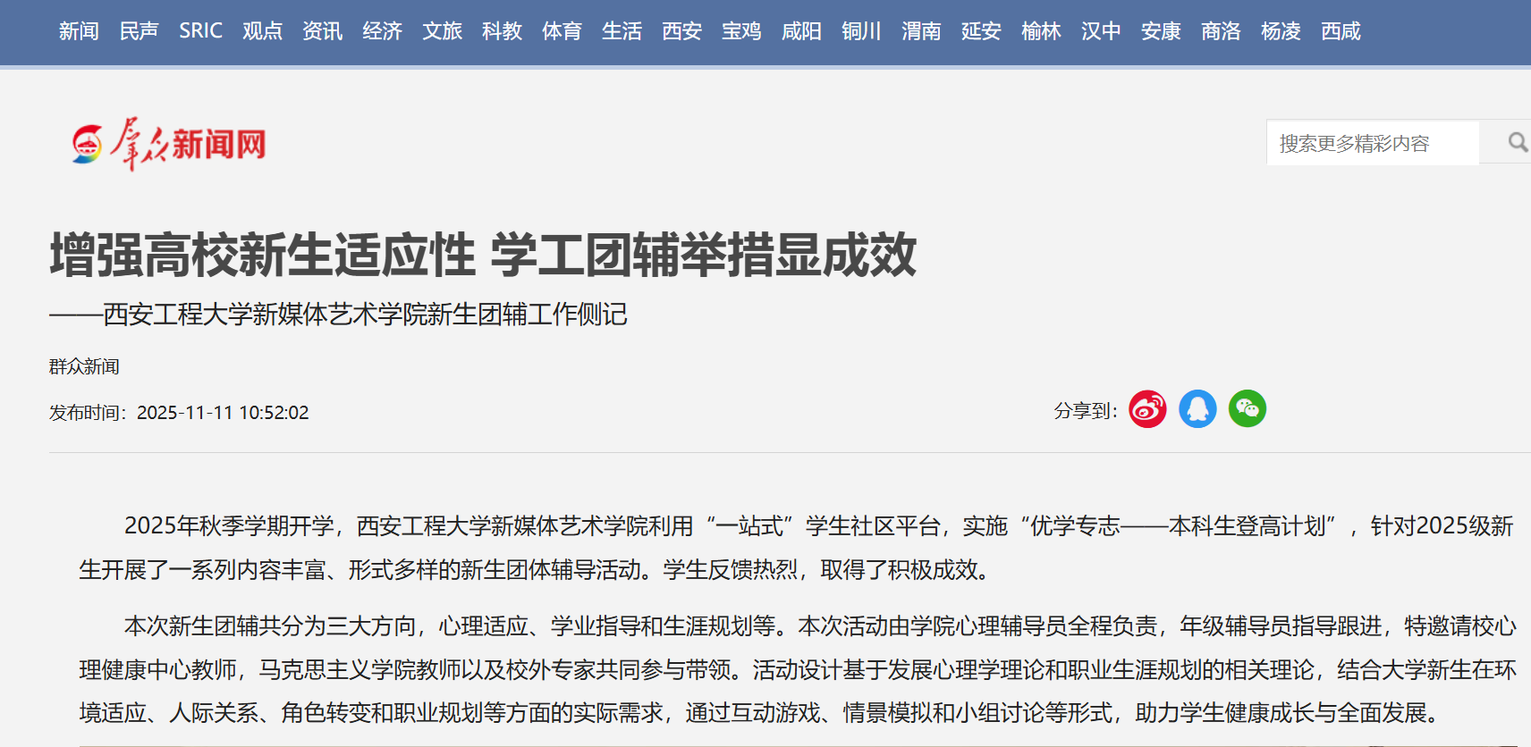 其中《增强高校新生适应性学工团辅举措显成效》(//www.sxdaily.com.cn/2025-11/11/content_11405852.html)一文从适应性团辅助力新生开启大学生活、学业探索为新生开启学业导航、生涯理论指引新生发展方向等三个方面完整介绍了学院创新新生团辅工作实施,内容新颖,具有强烈的现实意义。