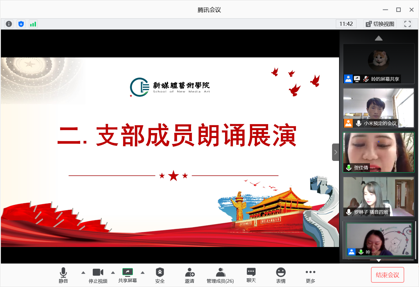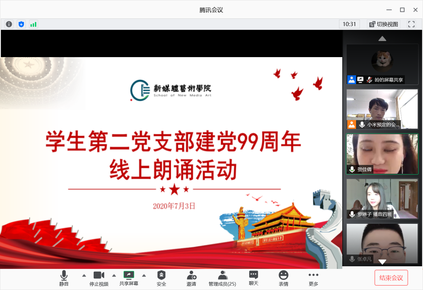 2020年7月3日,搜书吧 学生第二党支部通过腾讯会议平台开展“建党99周年”线上主题朗诵活动,会议由支部书记刘东欢主持,支部全体党员参加了此次活动。