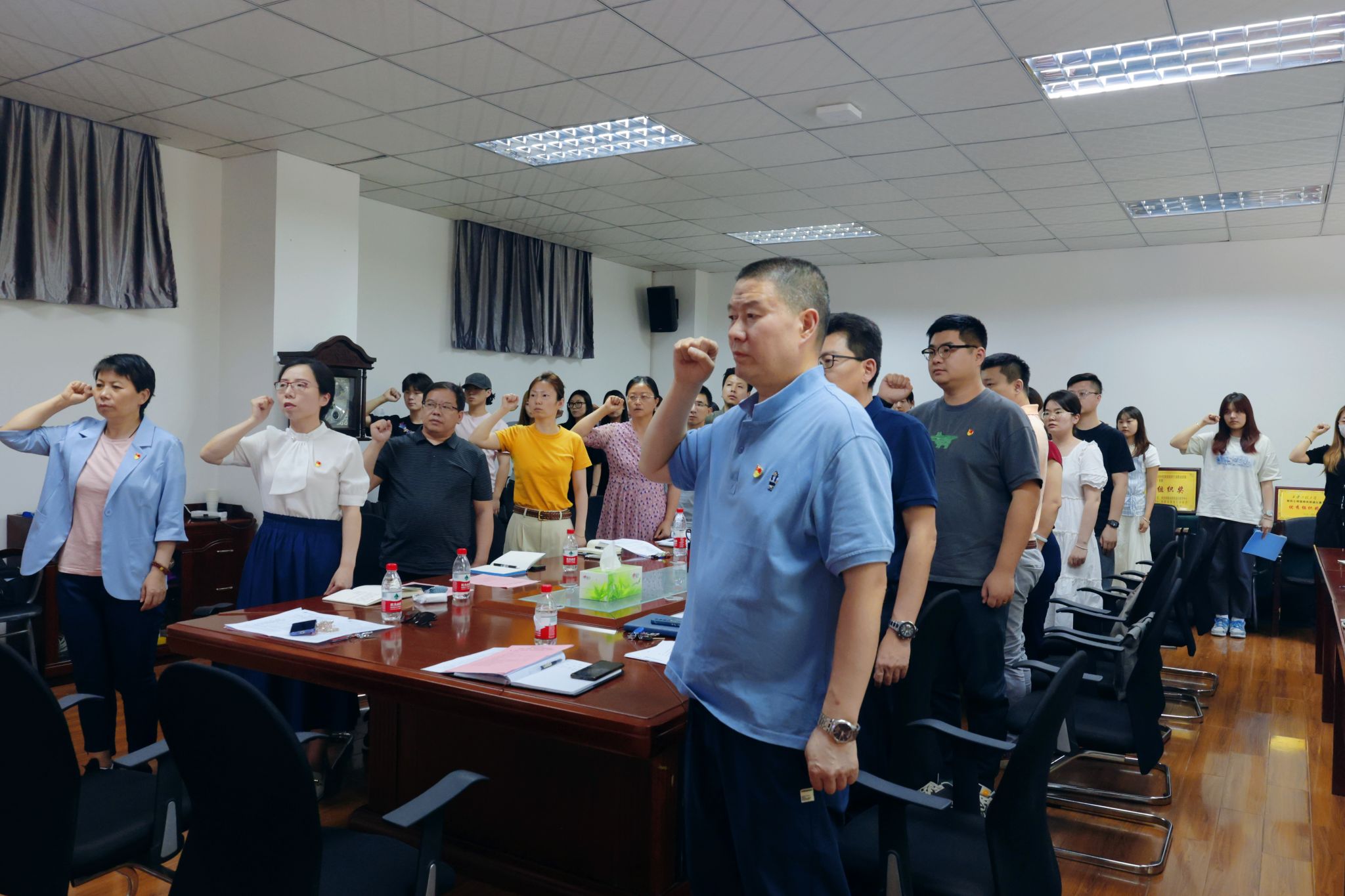 活动伊始,赵文熙宣读《搜书吧 “一站式”学生社区“学生党员示范宿舍”创建活动管理办法》和《搜书吧 宿舍文明公约》;随后,在领誓人副院长姒晓霞的带领下,与会党员面对鲜红的党旗,紧握右拳,庄严肃立,重温入党誓词;接着,班子成员为获得“学生党员示范宿舍”的宿舍授牌,并就党员作用发挥、宿舍文化建设、学风氛围营造、学业发展及规划等问题和师生们深入交流。