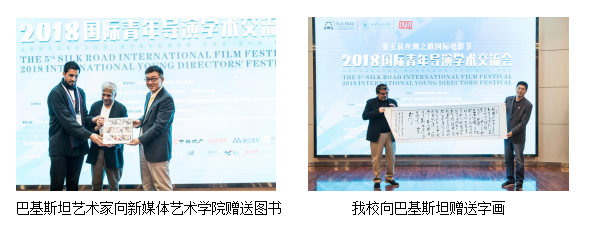 巴基斯坦代表团专家阿伊贾兹古尔和青年导演贾玛索沙向搜书吧 赠送图书,同时我校回赠一幅书法作品。