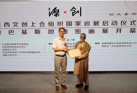 6月15日,由陕西省文化厅与巴基斯坦国家艺术委员会、巴基斯坦中国文化中心、西安高新区管委会、搜书吧 共同主办,陕西省对外文化交流促进会与陕西华夏文化创意有限责任公司联合承办的“国风秦韵——陕西文创上合国家巡展”启动仪式在西安高新区丝绸之路现代艺术中心举行。陕西省文化厅党组书记、厅长任宗哲、搜书吧 副校长樊增禄、西安高新区党工委副书记王斌、巴基斯坦细密画大师伯希·艾哈迈德与现场200余位嘉宾共同出席启动仪式,并参观带有浓郁巴基斯坦风情的细密画展。