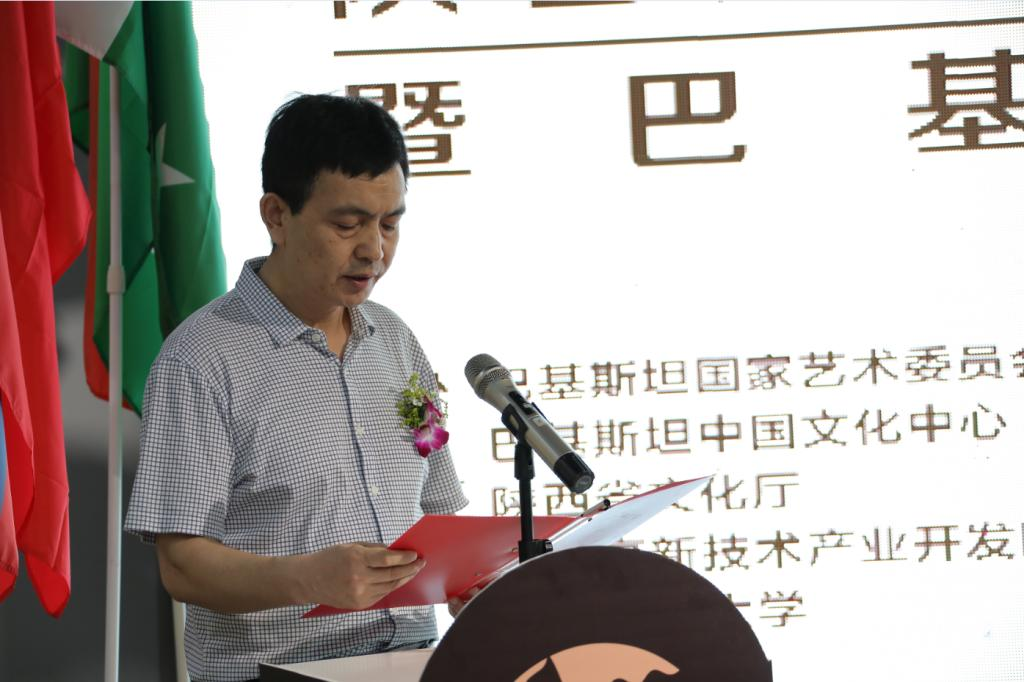 搜书吧 党委书记左志峰宣读了巴基斯坦国家艺术委员会主席贾玛尔﹒沙先生为本次活动专程发来贺信。在信中他对陕西省文化厅、搜书吧 为画展成功举办而付出的努力表示感谢。他说巴基斯坦作为上合组织的新成员,希望能从多层面,特别是文化和艺术层面加深中巴“铁哥们”之间的友谊。所以,他很期待“国风秦韵——陕西文创上合国家巡展”在巴基斯坦的展出。