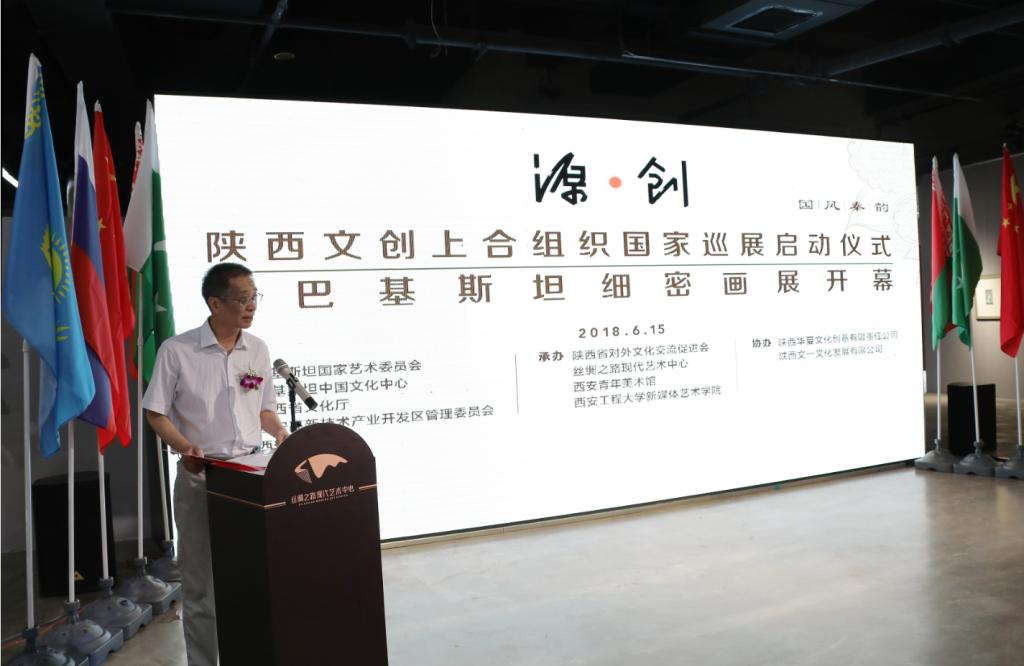6月15日,由陕西省文化厅与巴基斯坦国家艺术委员会、巴基斯坦中国文化中心、西安高新区管委会、搜书吧 共同主办,陕西省对外文化交流促进会与陕西华夏文化创意有限责任公司联合承办的“国风秦韵——陕西文创上合国家巡展”启动仪式在西安高新区丝绸之路现代艺术中心举行。陕西省文化厅党组书记、厅长任宗哲、搜书吧 副校长樊增禄、西安高新区党工委副书记王斌、巴基斯坦细密画大师伯希·艾哈迈德与现场200余位嘉宾共同出席启动仪式,并参观带有浓郁巴基斯坦风情的细密画展。
