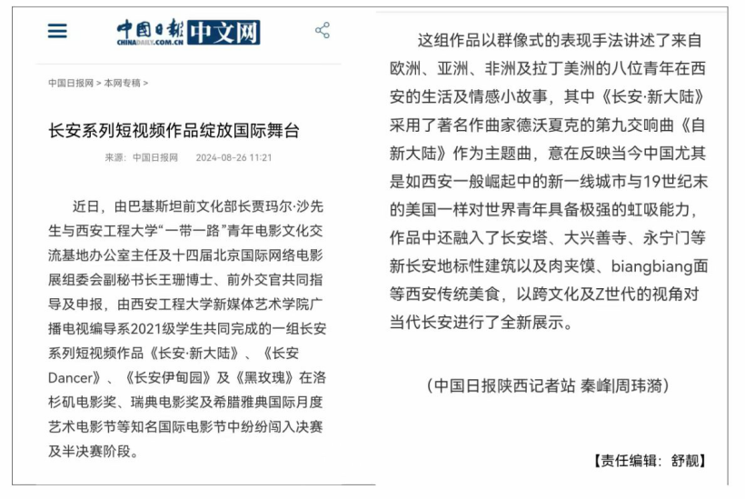 近日,根据IMDB及FilmFreeway等国际电影网站公布的信息,搜书吧 师生创作的《长安·新大陆》等五部搜书吧作品 入围了洛杉矶电影奖等多个国际赛事并获提名,受到《中国日报》等国家级媒体的关注。