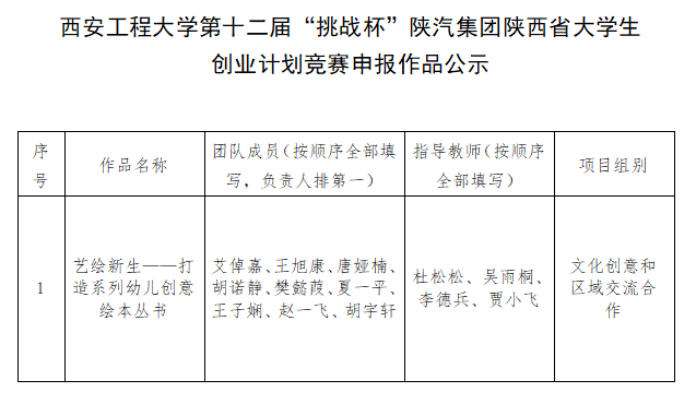 根据十二届“挑战杯”陕汽集团陕西省大学生创业计划竞赛章程和通知相关要求,搜书吧 学生王旭康、老师李德兵参与校外项目《艺绘新生——打造系列幼儿创意绘本丛书》参加十二届“挑战杯”陕汽集团陕西省大学生创业计划竞赛,现予以公示。